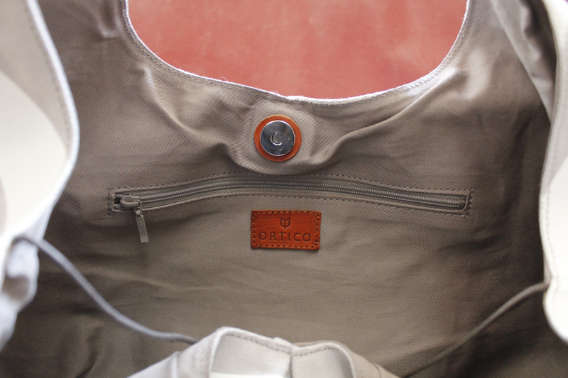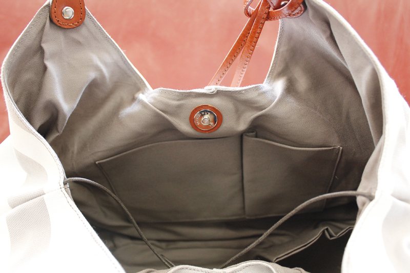 バッグの内側は、ファスナー付きポケット、反対側には、大小のポケットがあります。