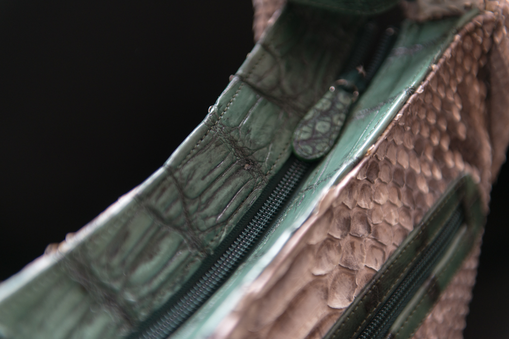 黒いヘビ革とグリーンのクロコ、強いもの同士の組み合わせは、逆にシック。